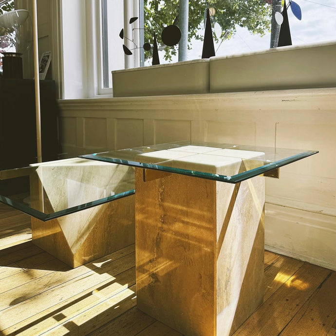 VINTAGE / Artedi Style Post Modern Travertine + Brass Coffee and Side Tables