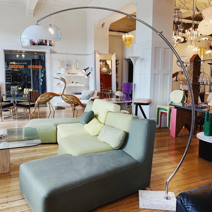 HARVEY GUZZINI / 1970s Chrome + Marble Italian Arc Lamp