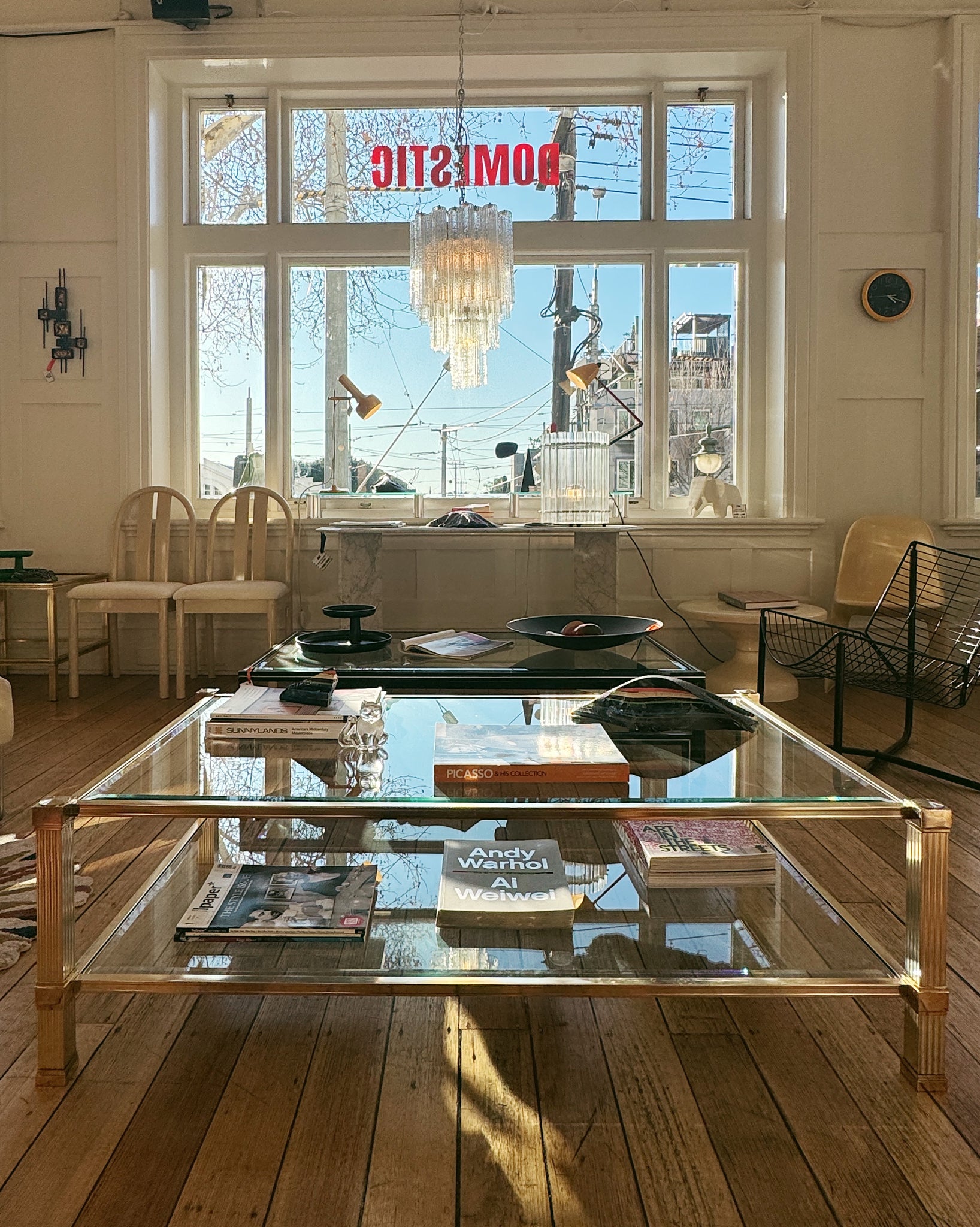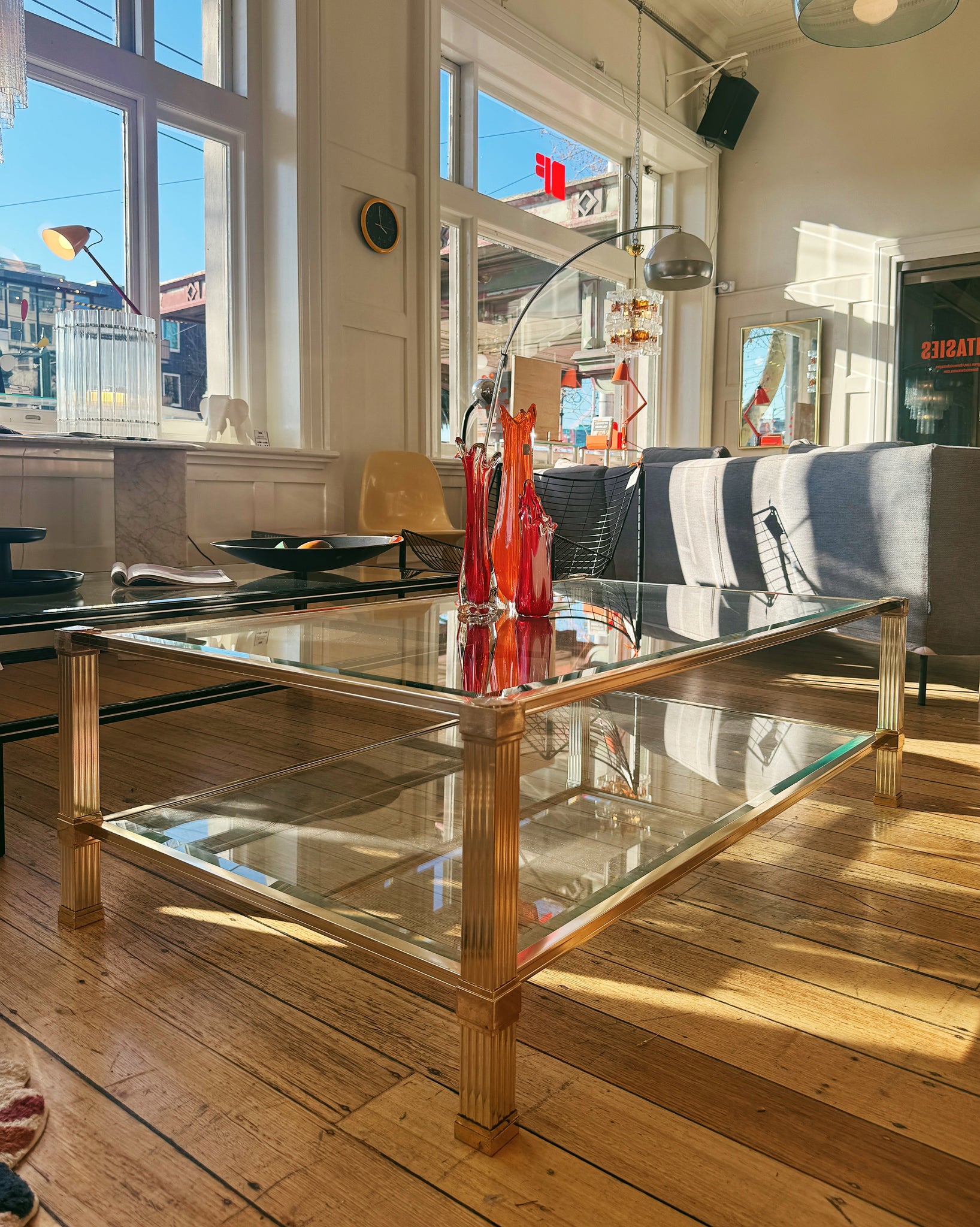A two shelf low coffee table with gold aluminium Roman pillar frame and clear beveled glass.