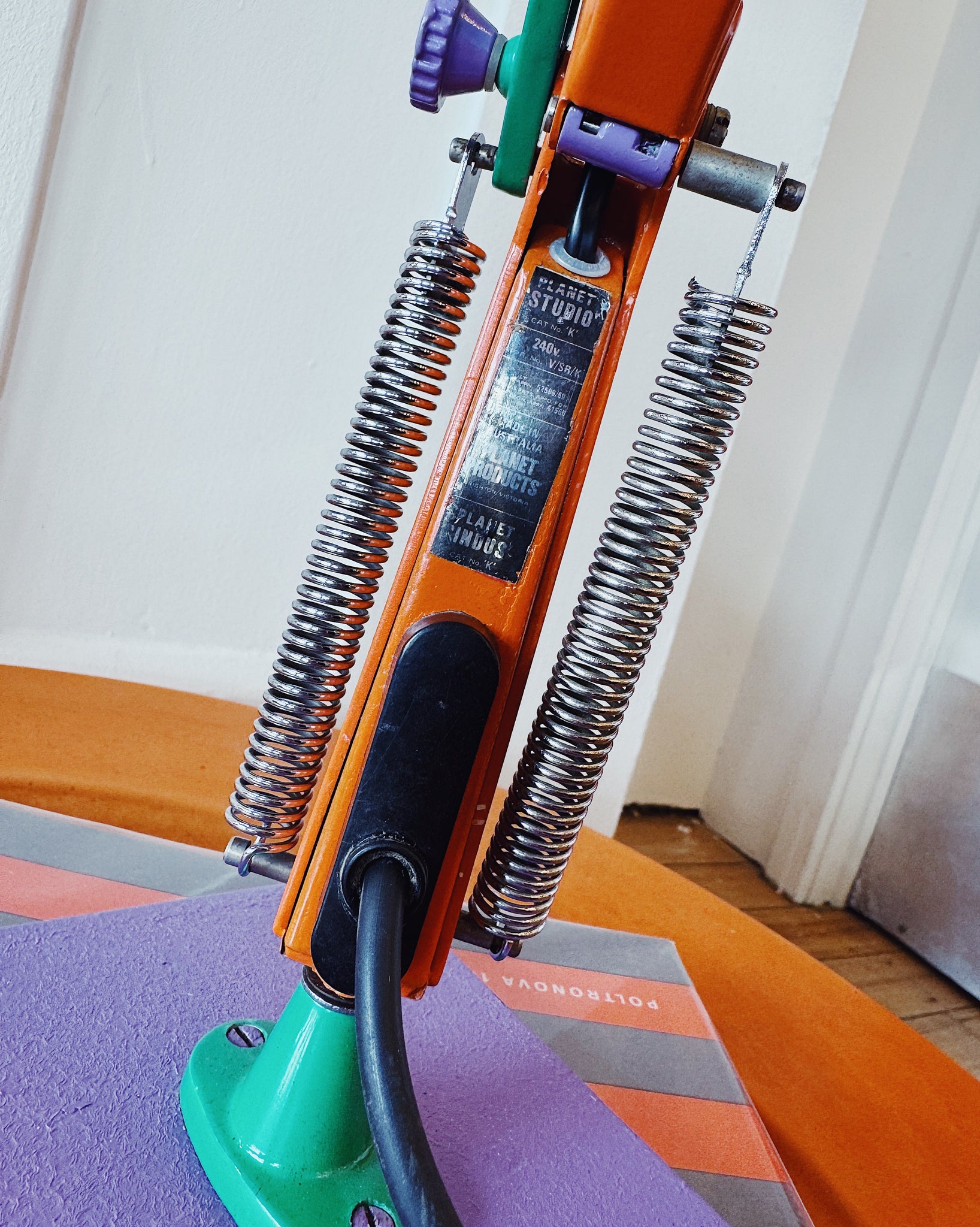 This lamp has been fully refurbished with brand new paint colours chosen by us in retro secondary colours orange, purple & green with black cord & black plug.