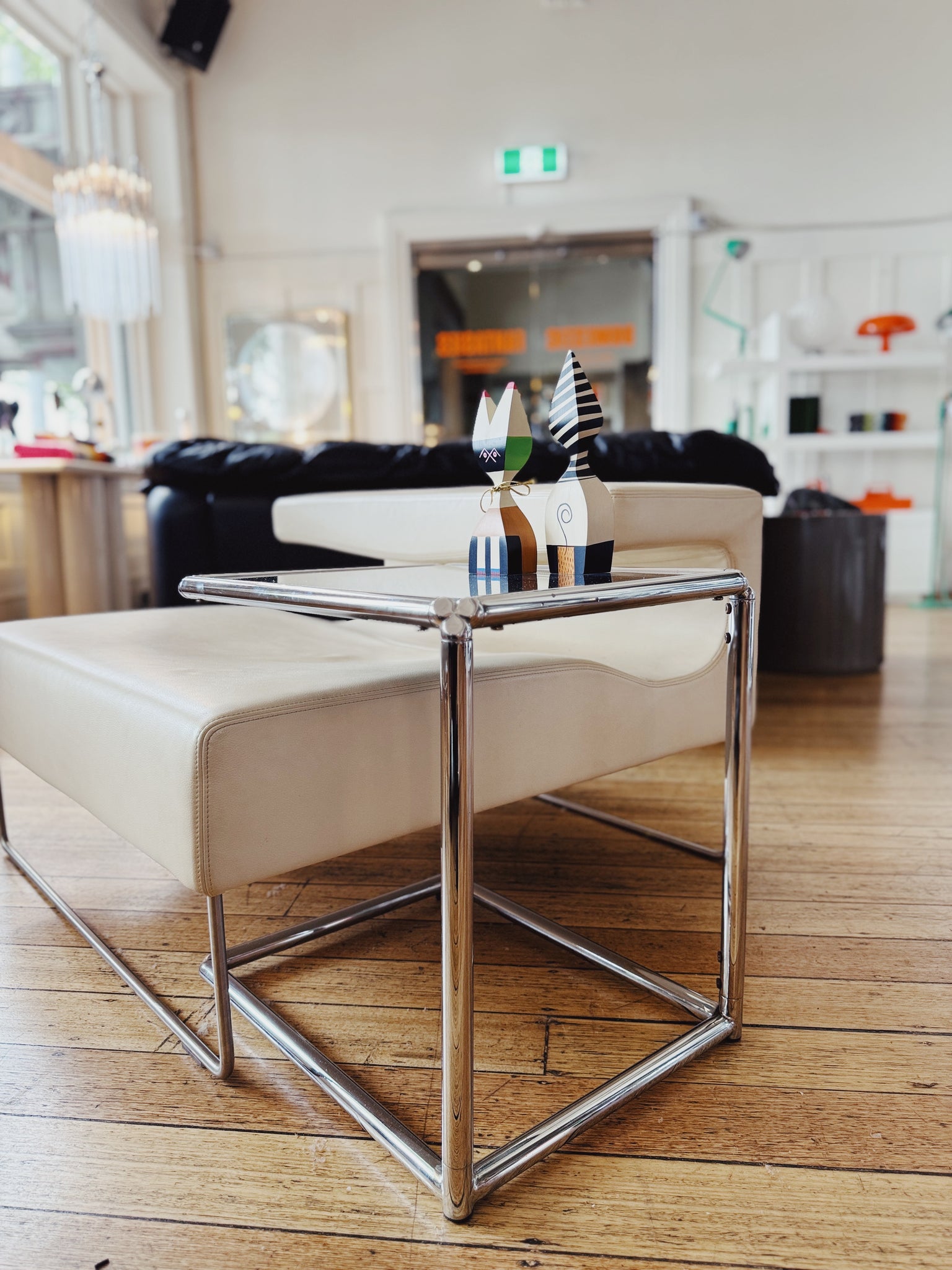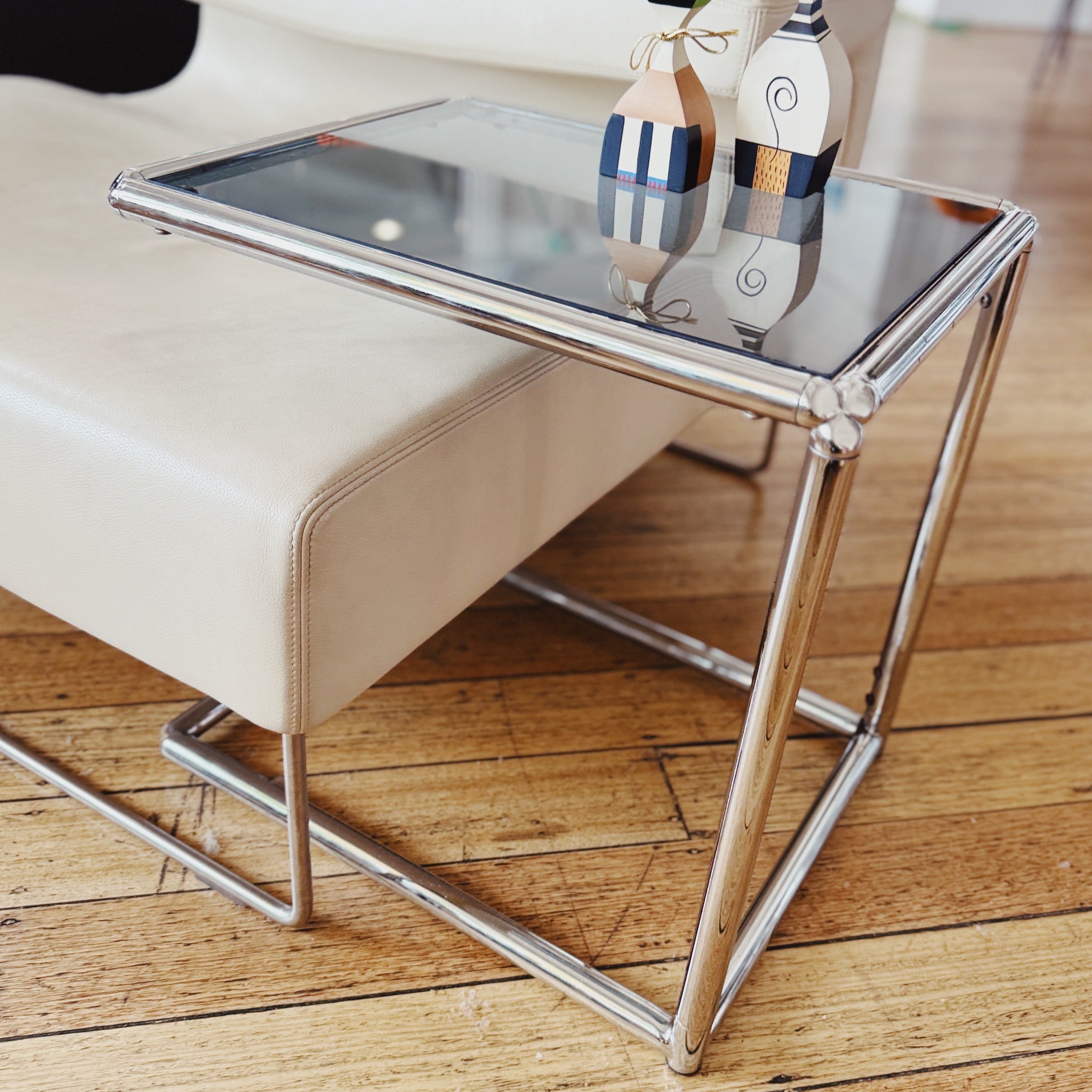 Small U table with chrome frame and smoky grey glass top. Perfect as a compact side table that tucks into sofas when there’s no room for a full coffee table. Measurements: TBA