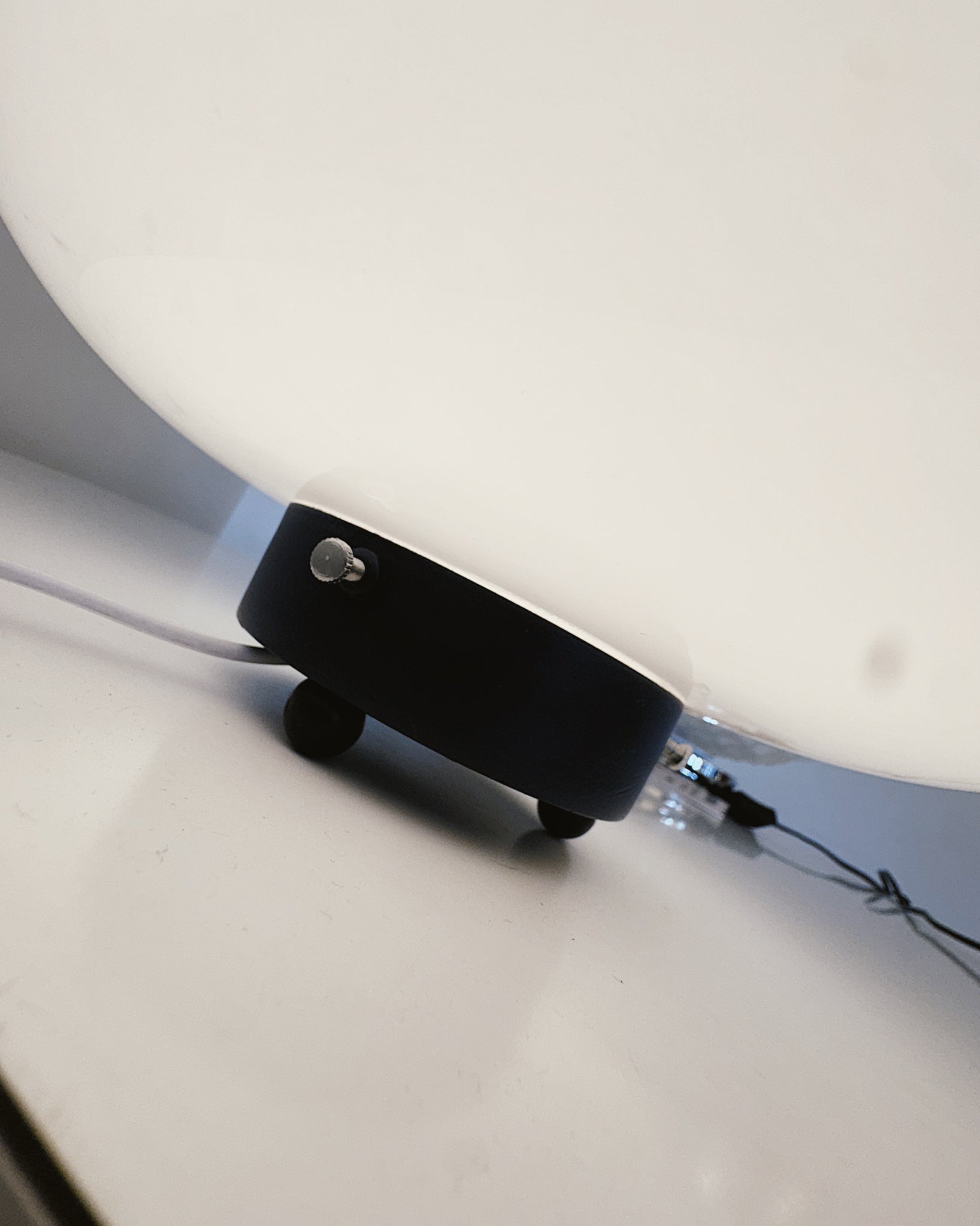 A white glass opaque shade on a navy base with ball feet. This perfect table lamp emits a glow perfect for the bedroom, lounge room and among books and decor on shelving.